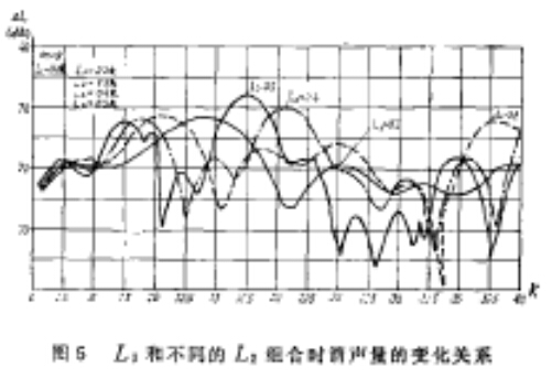 如圖所示:當(dāng)?shù)谝磺婚L(zhǎng)度L1為第二腔長(zhǎng)度的L2的一倍時(shí),雙腔消聲器明顯地對(duì)某些頻率失效,在某些頻段出現(xiàn)較深的低谷,因此在設(shè)計(jì)雙腔擴(kuò)張式消聲器時(shí),應(yīng)避免采用L1/L2=2的結(jié)構(gòu)方案。
